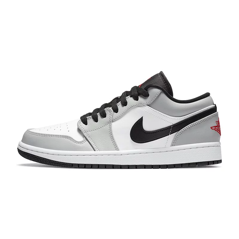 Nike Jordan 的AJ1 低筒鞋與高筒鞋款非常相似,具有乾淨、適合球場的外觀。這雙鞋尤其如此,這要歸功於鞋面使用低調的灰色、白色和黑色調色板。運動紅也融入其中,鞋舌處的 Jumpman 品牌和鞋跟處的翅膀刺繡。