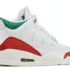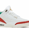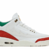Air Jordan 3 Retro ‘El Vuelo’ 以鮮明的墨西哥自由式摔角傳統致敬墨西哥傳統。這款鞋採用白色皮革鞋面,搭配鋸齒狀中足覆層,並飾以鱗片紋理。綠色襯墊鞋領、紅色前掌和後跟覆層也呈現類似爬蟲類的圖案。金屬金色模壓鞋眼與鞋舌和後跟上的 Jumpman 標誌相呼應。每雙鞋的鞋舌內側均鎘刻有「Más vale maña que fuerza」(我愛你,我的力量)字樣,大致意為「智慧勝過力量」。