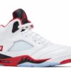 2025 年 Air Jordan 5 Retro “Fire Red” 採用紅色泡棉中底,並輔以可視 Nike Air 緩震氣墊。鞋側黑色鯊魚齒細節與透明外底相得益彰,延續經典外觀。白色皮革鞋面保留了經典的側網設計,並飾有撞色黑色鞋眼。紅色 Jumpman 標誌與黑色鞋舌形成鮮明對比,後跟處則點綴著刺繡「23」字樣。