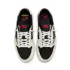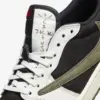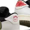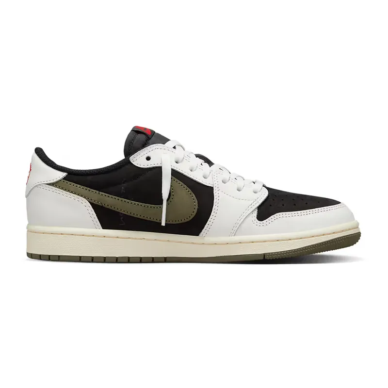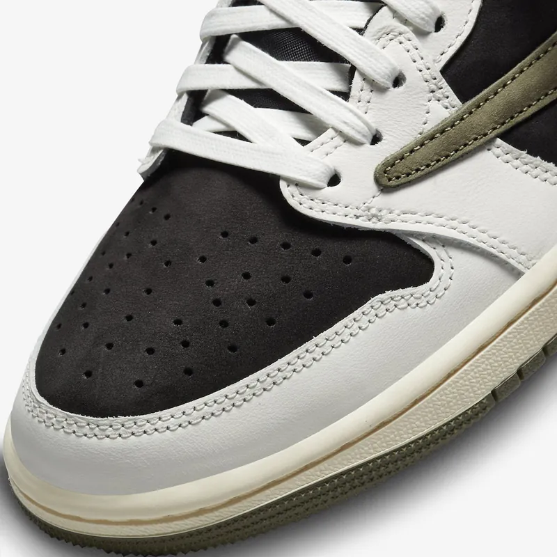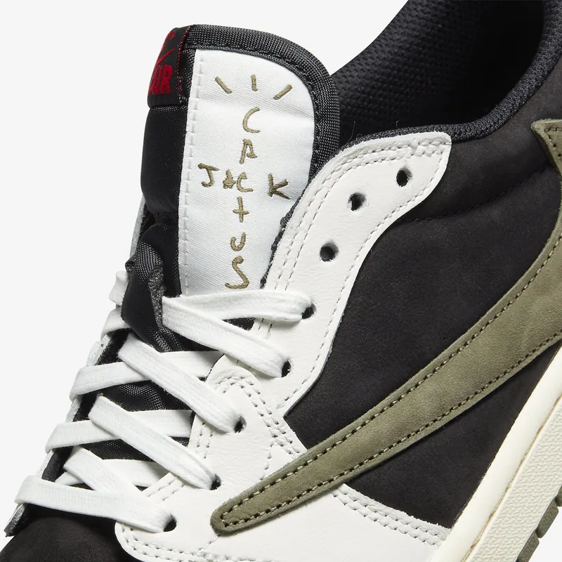 穿著帆布、大學紅、黑色和中等橄欖色配色方案。Travis Scott x Air Jordan 1 Low的這款產品採用黑色麂皮底和 Sail 皮革覆蓋層。其他細節包括橄欖色絨面革 Swooshes、鞋帶和“Cactus Jack”鞋舌品牌,“Nike Air”鞋舌品牌和刺繡鞋跟上帶有紅色點綴。帶有圖形鞋墊的 Olive 橡膠外底上的 Sail 中底完善了設計。這款鞋將提供加大尺碼,並採用特殊包裝並配有額外的鞋帶。